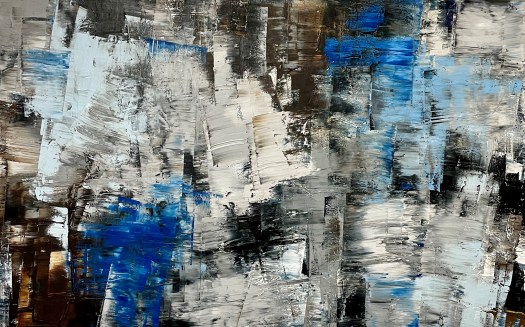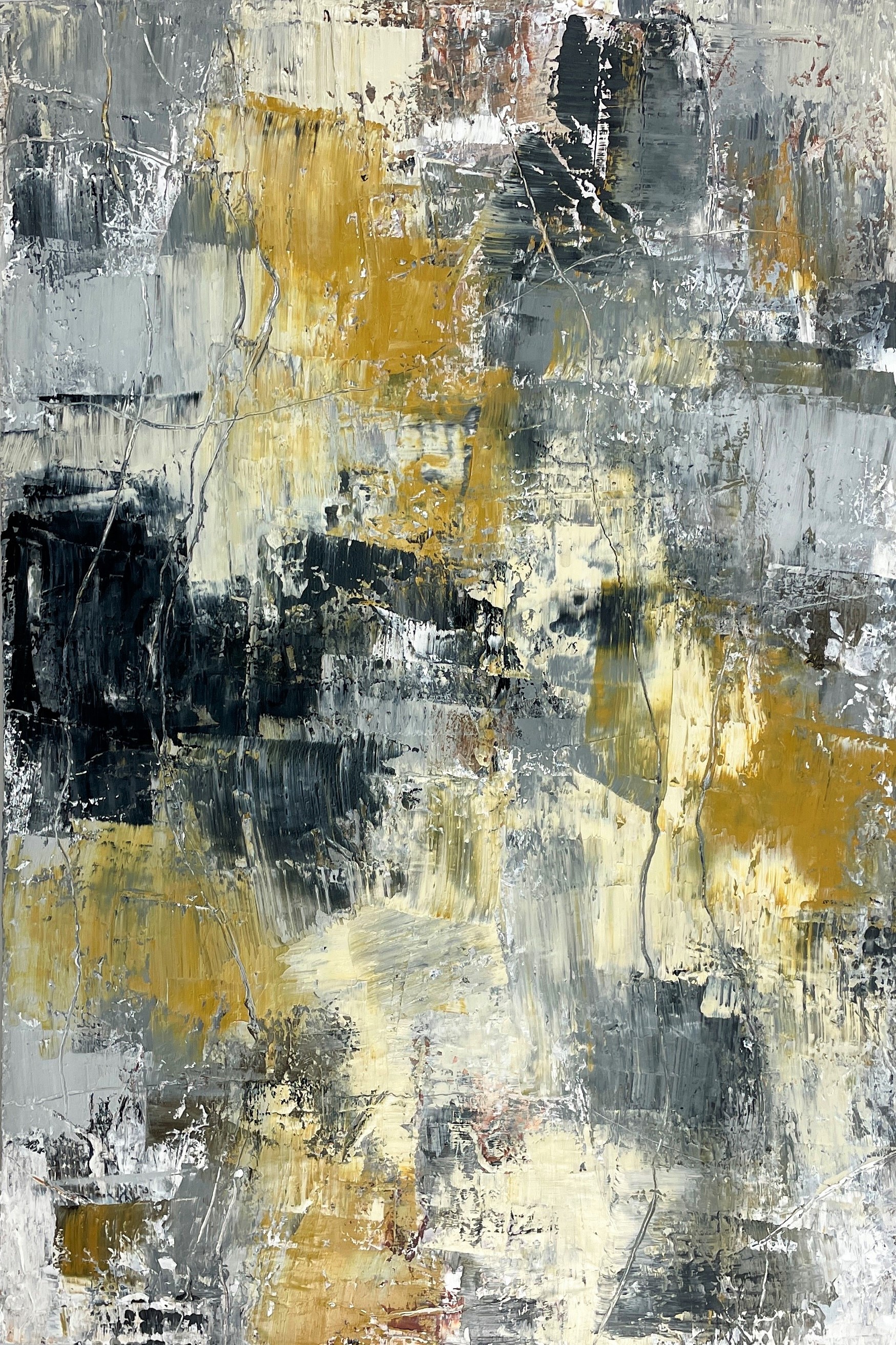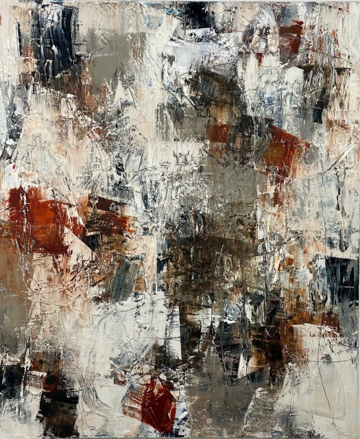 Imbued with intense raw emotion and quiet tranquillity, each painting was created with thick multilayered, heavily textured oils that took the artist several months to complete. Rarely using brushes, she prefers the physical act of moving, scraping and removing paint with palette knives. The paintings went through many lives or “seasons”, changing drastically during the process, depending where her inspiration took her.